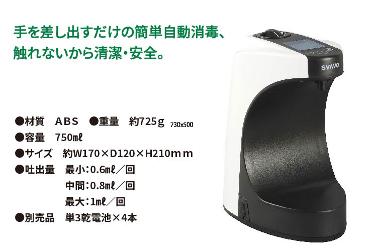 液晶ボタンで吐出量を調整。据え置き型液晶タイプオートディスペンサー。 センサー感知で本体に触れないので、交差汚染や接触感染の予防にも有効です。 吐出量:3段階調整機能付き