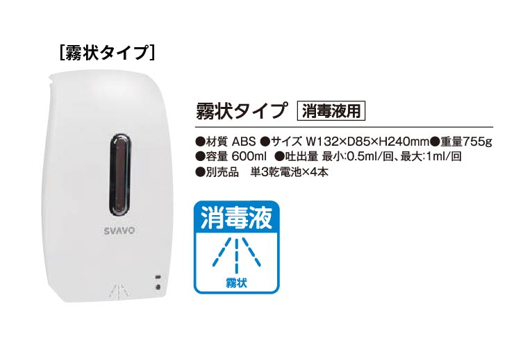 直接「触れない」ことで二次感染の対策につながります。使用量に合わせて吐出量の設定が可能です。作動時はLEDが緑に点灯、電池切れを赤の点灯でお知らせ。