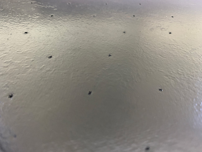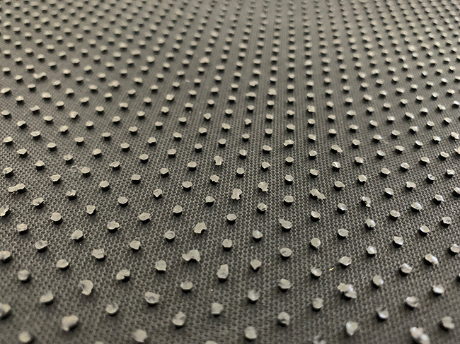 マット裏面ラバーに水抜き用の穴を開ける加工です。脱水時・乾燥時のマットの負荷を軽減し、マットの損傷を防ぎ、また、洗濯加工に掛かるコストも軽減します。 弊社では「分割脱水方式」を推奨しておりますが、お持ちの設備によりこの方式を採用できない方にはこの通常の連続脱水方式で分割脱水方式と同程度の効果を上げる事ができる「パーフォレート加工」をお勧めしています。マットを洗濯する際、マットの折り目にはどうしても水が滞留(ウォーターポケット)します。 この滞留した水に脱水時の遠心力によって過度の圧力がかけられると、部分的な基布剥離(スポットデラミ)やマットの裂けを引き起こす要因となります。また、この滞留水は、長時間の脱水後でもマット面に残ってしまうため次の乾燥工程でも長時間を要することになり、マットに負荷を与えるだけでなく、エネルギーコストも上昇させます。「パーフォレート加工」で無数の小さな孔を開けることにより、脱水時に滞留するはずの水が抜けるようになり、効率よく脱水する事が可能となります。